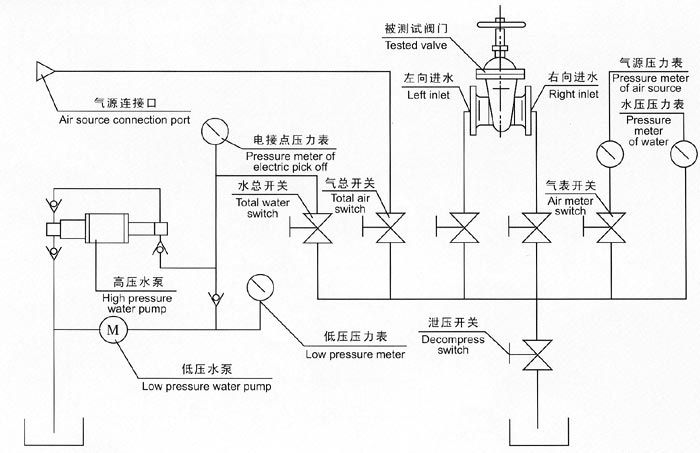 六、液壓供壓水泵開始工作前,先調(diào)節(jié)好電接點(diǎn)壓力表與被試驗(yàn)閥門壓力相同,然后進(jìn)行工作。